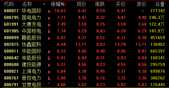 电力板块今日盘中强势拉升,截至收盘,华电国际涨停;国电电力、大唐发电、中国核电等涨超7%。港股方面,大唐发电涨逾11%,华电国际电力股份涨超10%,中国电力、华润电力等涨超5%。