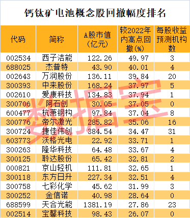 最新收盘价与年内高点相比,钙钛矿电池概念股平均回撤34.96%。西子洁能、杰普特回撤幅度超过40%。西子洁能回撤幅度49.97%排在首位,公司上半年净利润同比下滑61.43%。