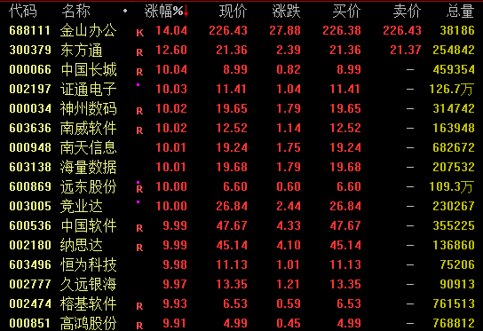 信创概念盘中强势拉升,截至收盘,金山办公大涨14%,东方通涨12.6%,中国长城,证通电子、南威软件、南天信息、海量数据、竞业达、中国软件、纳思达等逾10股涨停。