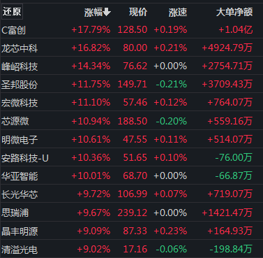 半导体赛道领涨,华亚智能涨停,龙芯中科涨超16%,芯源微、圣邦股份、明微电子等多股涨超10%。