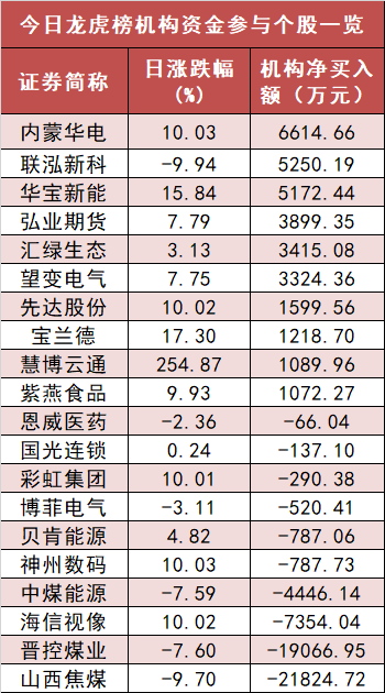 盘后龙虎榜数据显示,机构现身20股,其中内蒙华电等10股现机构资金净买入,山西焦煤等10股呈现机构资金净卖出。