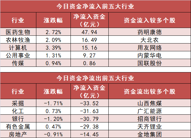 申万一级行业中,6个行业实现资金净流入,其中医药生物行业净流入47.94亿元居首。