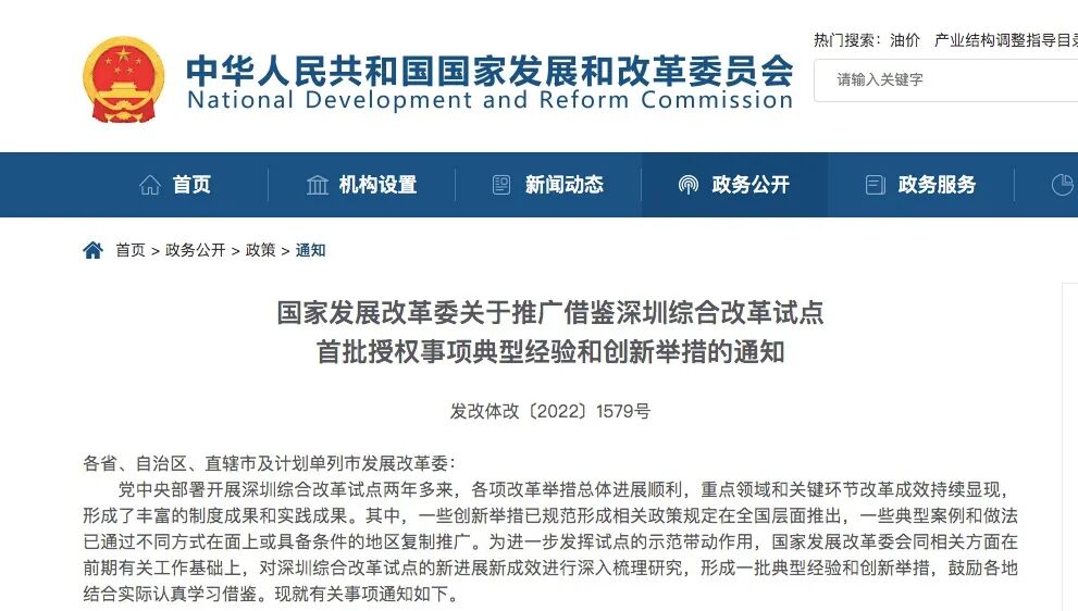 通知指出,党中央部署开展深圳综合改革试点两年多来,各项改革举措总体进展顺利,重点领域和关键环节改革成效持续显现,形成了丰富的制度成果和实践成果。其中,一些创新举措已规范形成相关政策规定在全国层面推出,一些典型案例和做法已通过不同方式在面上或具备条件的地区复制推广。
