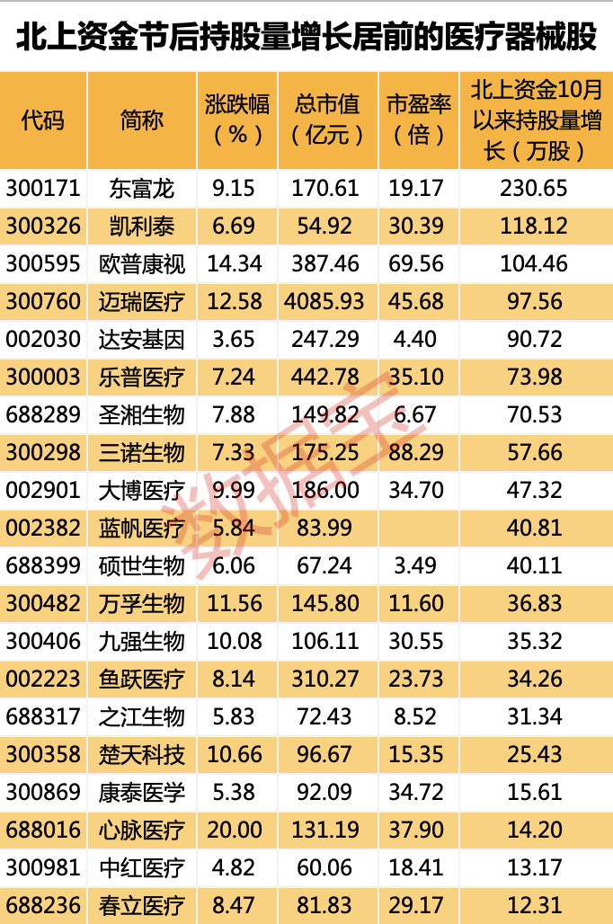 10月以来,部分医疗器械概念股获北上资金持股数量上升。证券时报·数据宝统计,29只医疗器械股节后以来北上资金持仓增加,东富龙、凯利泰、欧普康视持股量增长最多,均超过百万股。
