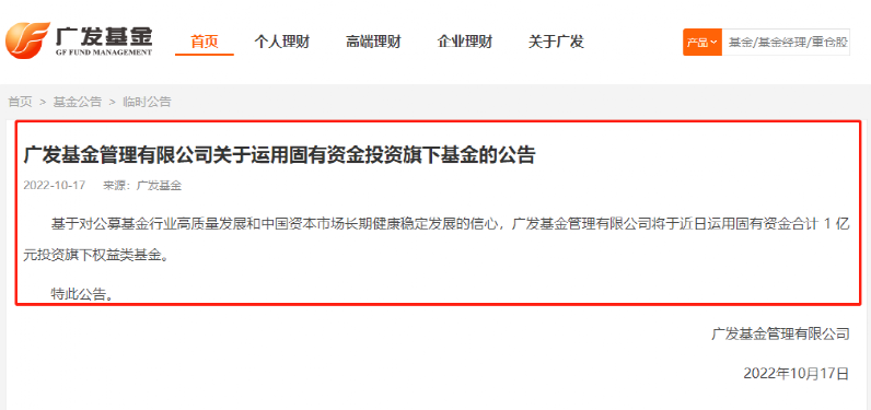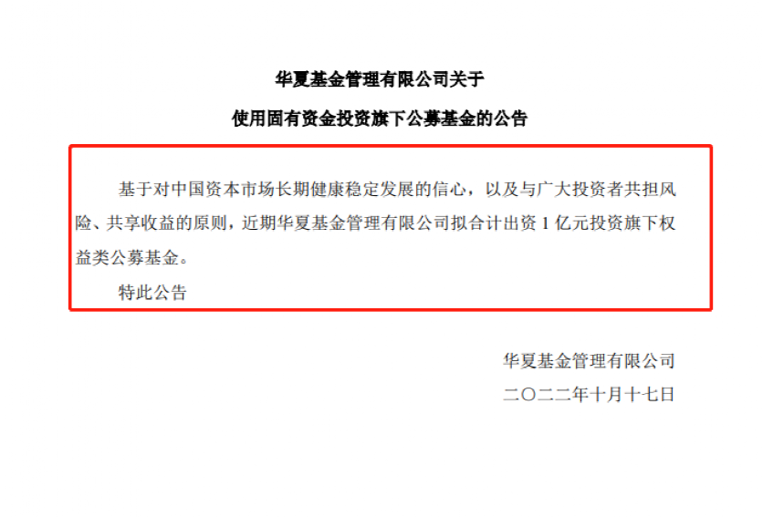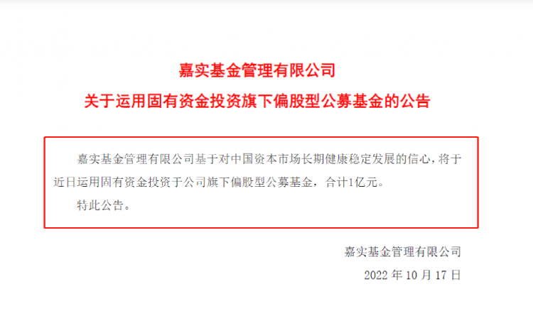 同时,10月17日,嘉实基金也发布公告称,嘉实基金基于对中国资本市场长期健康稳定发展的信心,将于近期运用固有资金1亿元投资于本公司旗下偏股型公募基金。