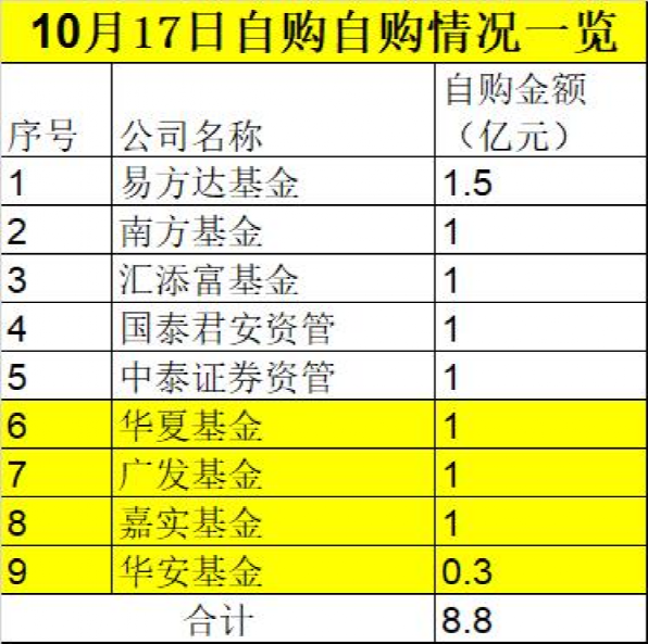 10月17日,继易方达、南方、汇添富基金、国泰君安资管、中泰证券资管等机构发布自购公告后,华夏、广发、嘉实、华安等基金公司也快速跟上,拿出“真金白银”自购公司旗下权益类产品。