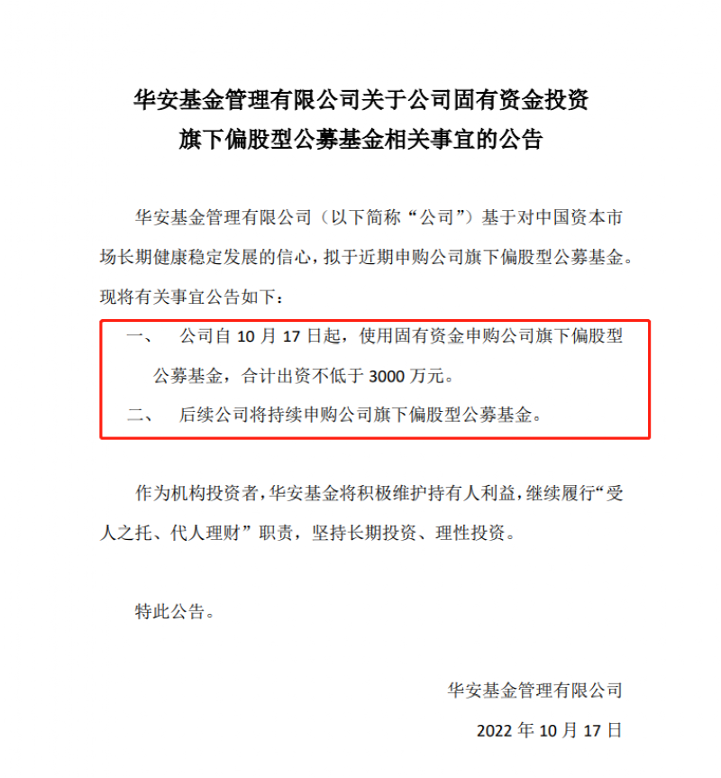 华安基金10月17日发布公告称,基于对中国资本市场长期健康稳定发展的信心,以及与广大投资者共担风险、共享成长的原则,将使用固有资金申购公司旗下偏股型公募基金,合计出资不低于3000万元。同时,公告还表示,后续公司将持续申购公司旗下偏股型公募基金。华安基金坚持以客户为中心,坚持长期主义,始终与基金持有人共进退。