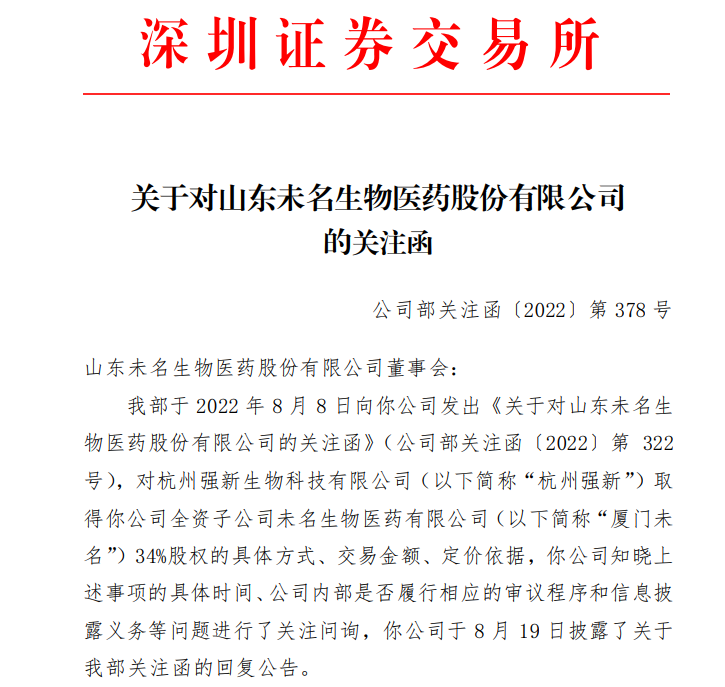 简要回顾前史。8月8日,深交所对未名医药下发关注函,称收到投资者投诉,杭州强新以约29亿元入资厦门未名,获得约34%的股份,该事项已于2022年5月18日完成工商变更。