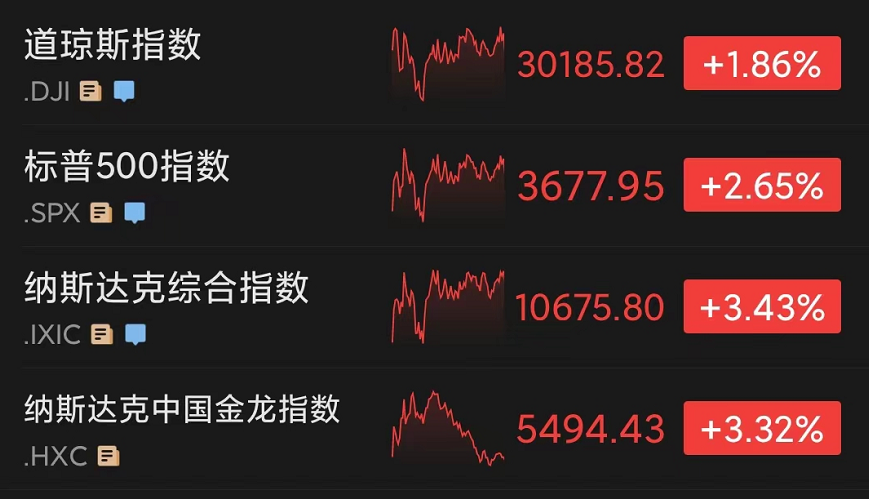 本周首个交易日,美股三大指数集体收涨。道指涨1.86%,收复30000点大关;标普500指数涨2.65%,重返3600点上方;纳指涨3.43%,创7月份以来最好表现。大型科技股普涨,特斯拉涨7%,亚马逊涨超6%。热门中概股走强,纳斯达克中国金龙指数涨3.32%,阿里巴巴、拼多多、京东涨约5%。