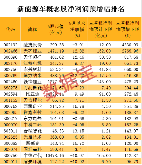 证券时报·数据宝统计,新能源车概念股中,从目前的业绩预告来看,前三季度净利润预增的公司占披露总数的九成以上。