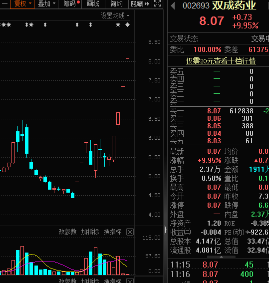 仿制药指数涨幅排名第一位,概念股华森制药、京新药业、双成药业涨停。双成药业早盘封单居首,超60万手封住涨停板,该股已连续录得4个涨停板,是目前医药板块连续涨停数量最多的1只。