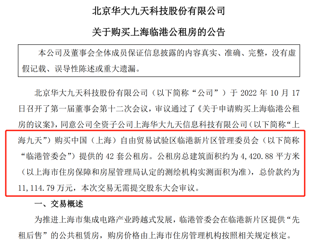 10月18日华大九天公告,公司全资子公司上海华大九天信息科技有限公司(下称“上海九天”)拟购买中国(上海)自由贸易试验区临港新片区管理委员会(下称“临港管委会”)提供的42套公租房。公租房总建筑面积约为4420.88平方米(以上海市住房保障和房屋管理局认定的测绘机构实测面积为准),总价款约为1.11亿元,本次交易无需提交股东大会审议。