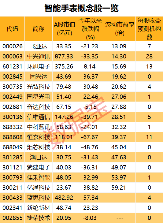 证券时报·数据宝统计,A股市场上具备智能手表业务的公司不足20家。截至10月20日收盘,超四成概念股滚动市盈率低于30倍,其中飞亚达滚动市盈率13.09倍处在最低位置,公司主要通过旗下"Jeep"品牌经营智能手表业务。