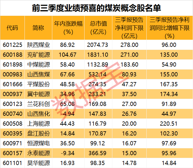 业绩方面来看,目前有13股已经披露了前三季度业绩预告,业绩均预喜。按照预告下限数据来看,上市公司业绩强劲增长,其中陕西煤业、兖矿能源、中煤能源的前三季度归母净利润均超百亿元。
