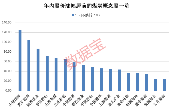 证券时报·数据宝统计,A股煤炭行业共39股,年内平均上涨21.63%,近七成概念股年内累计涨幅录得正值,其中山煤国际、兖矿能源的股价涨幅居前,年内分别累计上涨125.49%和104.67%。