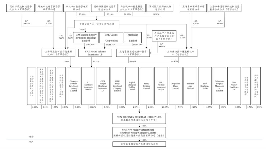 新里程健康的唯一股东国科新里程,注册在香港地区,股本为10000港元,成立时间为2012年3月。而国科新里程的唯一股东为新里程医院集团有限公司(下称新里程集团),注册在开曼。即,新里程健康为新里程集团的全资孙公司。