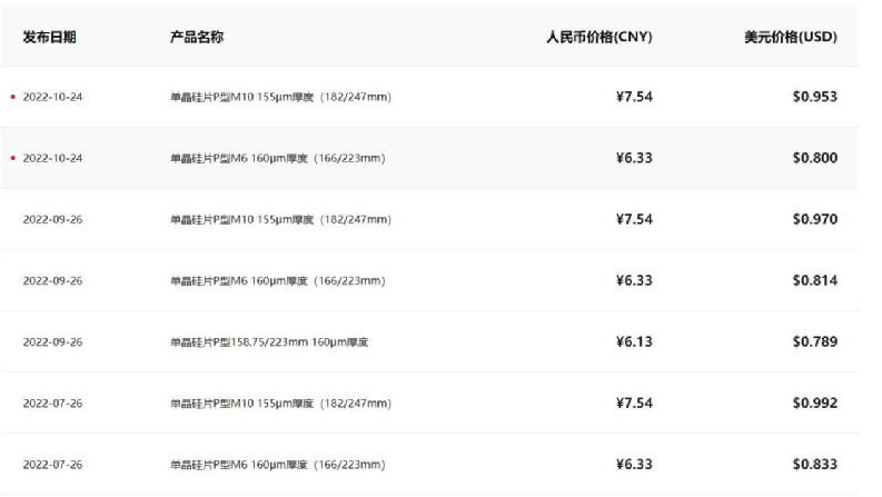 根据隆基绿能官网显示,与9月26日相比,其单晶硅片P型M10 155μm厚度(182/247mm)和单晶硅片P型M6 160μm厚度(166/223mm)的人民币单价仍旧为7.54元和6.33元,并无变化。而这一价格自7月26日以来,已经保持了3个月未变。