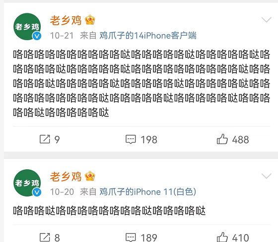 “咯咯哒”也是老乡鸡最出圈的网红梗之一。老乡鸡官方微博几乎每天都会更新“花式咯咯哒”文案,几乎每条略显鬼畜的“咯咯哒”文案都会获得约200条网友评论互动。这个梗起源于2020年,束从轩在某日“咯咯哒”微博下评论“你每天就是这样糊弄工作的?”一举带动了网友的互动热情。