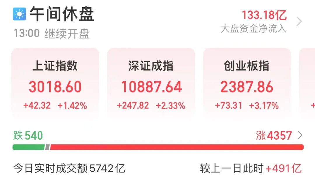 受多重利好消息影响,今天早盘A股飙涨。截至上午收盘,上证指数大涨1.42%,重回3000点大关;创业板指走势强劲,大涨3.17%。