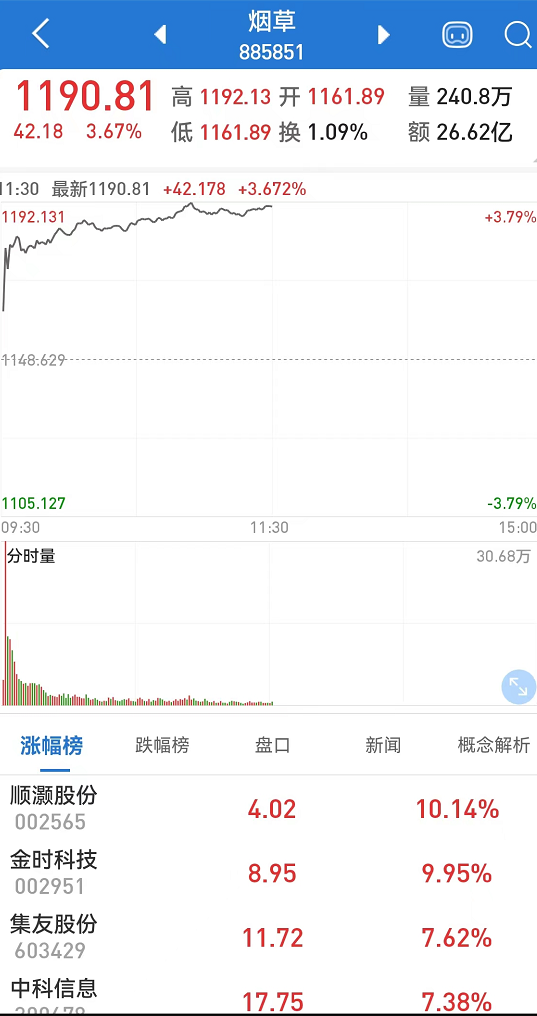 AH电子烟概念股早盘联袂走强,A股烟草概念指数放量高开高走,单边上扬近4%,半日成交超昨日全天成交,顺灏股份、金时科技高开后均直线秒涨停,集友股份、华宝股份等均大幅上扬。