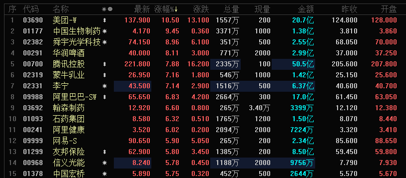 港股市场的蓝筹股涨幅都比较大,美团上涨超10%,中国生物制药上涨超9%,腾讯控股上涨近8%,阿里巴巴上涨近7%。