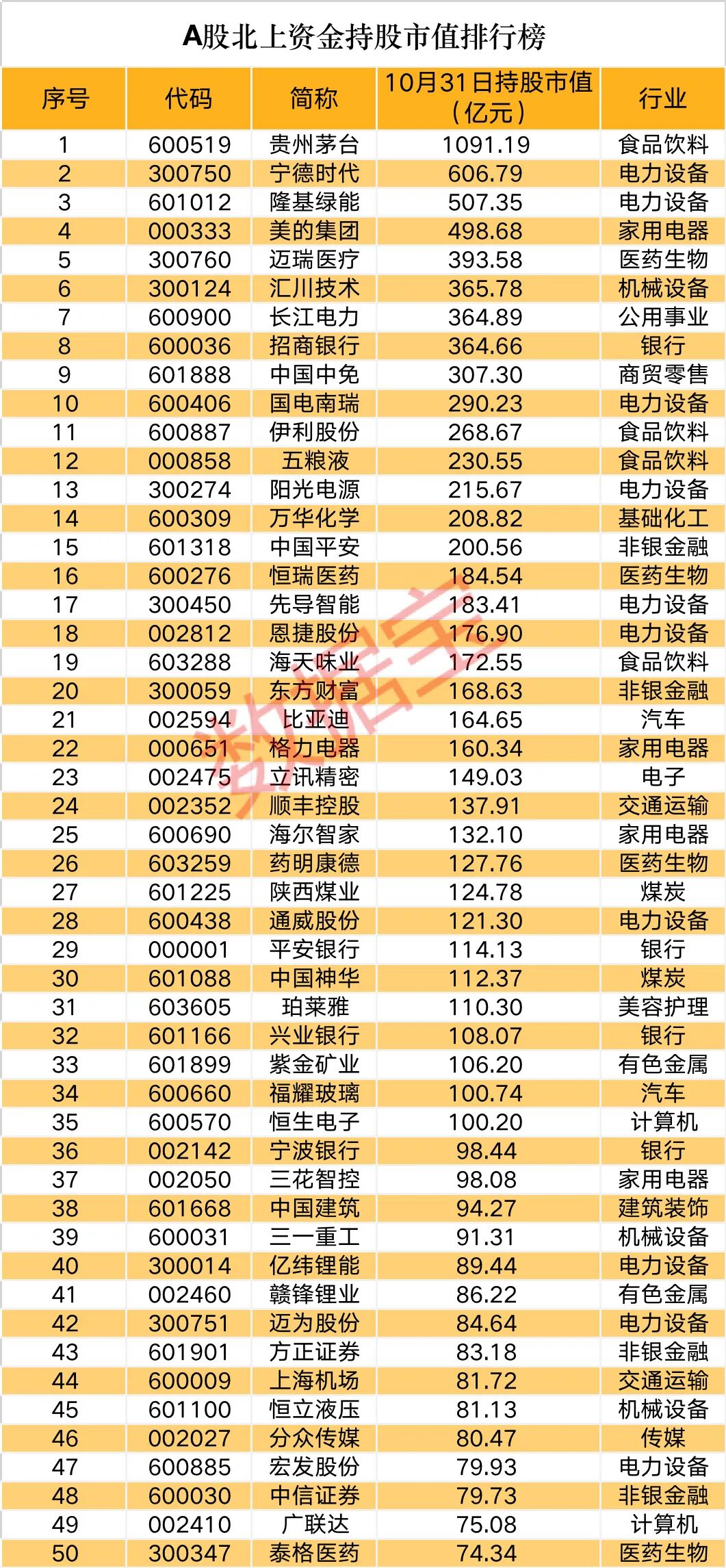北上资金持股市值50强出炉