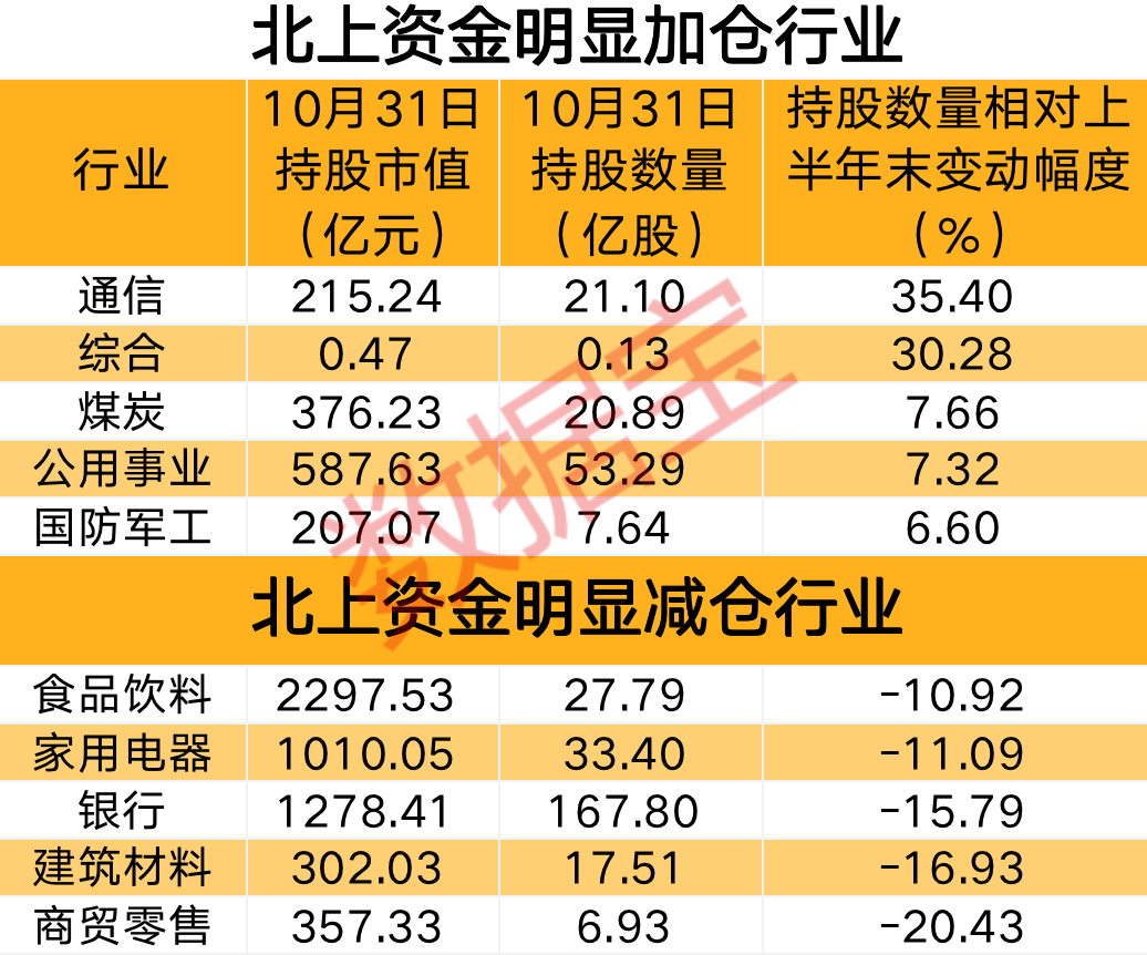 与上半年末相比,北上资金持仓也有一定幅度的变动,证券时报·数据宝以10月31日北上资金持股数量、持股市值为基准,数据显示,7个行业最新持股数量较上半年末增长了5%以上,通信、煤炭、公用事业、国防军工等行业获明显加仓,减持较多的则有商贸零售、建筑材料、银行等行业。
