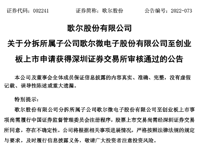 10月19日晚,歌尔股份发布公告称,旗下子公司歌尔微通过深交所创业板上市委审议会议,离IPO仅一步之遥。