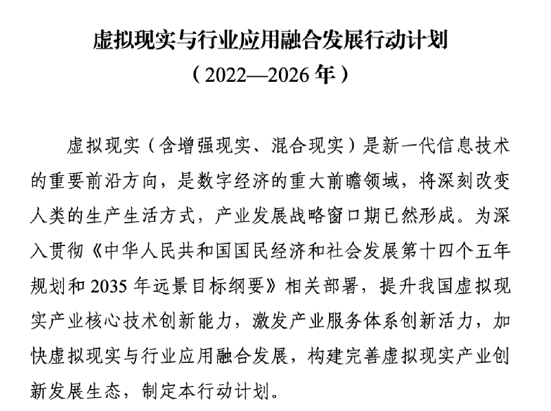 据悉,近期,工业和信息化部、教育部、文化和旅游部、国家广播电视总局、国家体育总局印发印发《虚拟现实与行业应用融合发展行动计划(2022—2026年)》(下称《行动计划》),计划2026年虚拟现实产业总体规模(含相关硬件、软件、应用等)超3500亿元,虚拟现实终端销量超过2500万台。