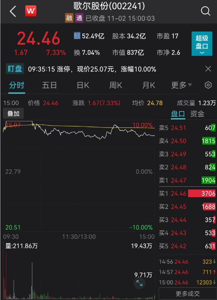 11月2日(本周二),龙头股歌尔股份早盘一度封涨停,然后打开,到了下午收盘,歌尔股份涨7.33%,报收24.46元/股;全天成交额52.49亿元,换手率为7.04%。市场交投明显比之前活跃,最新总市值为837亿元。