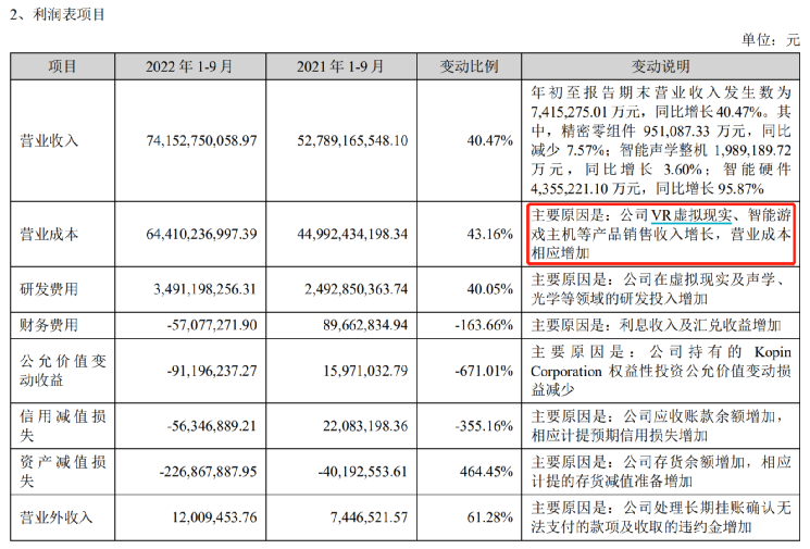 具体来看,营收方面,其中,精密零组件95.11亿元,同比减少7.57%;智能声学整机198.92亿元,同比增长3.60%;智能硬件435.52亿元,同比增长95.87%。营业成本方面,今年前三季度同比增长43.16%。歌尔股份称,主要原因是公司VR虚拟现实、智能游戏主机等产品销售收入增长,营业成本相应增加。