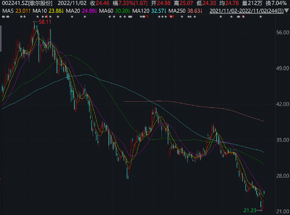 但是,近一年来,歌尔股份的股价却大幅下跌,从去年12月的58元附近一路震荡下跌,今年5月、8月出现一波小反弹,但是最新到10月一度跌至21元附近的低位;尽管近期有所回暖,最新股价已经较当时的高点,出现腰斩,最新收盘价为24.46元/股。