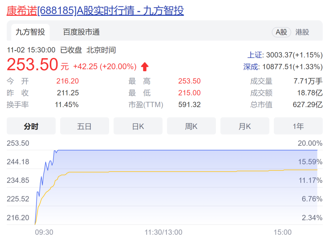 11月2日,康希诺A股和H股联袂上涨。截至收盘,A股康希诺(688185)以20%涨停,近7个交易日累计涨幅已达96%,几近翻倍;H股康希诺生物(HK6185)大涨超63%,近7个交易日累计涨幅达190%,翻了接近两倍。