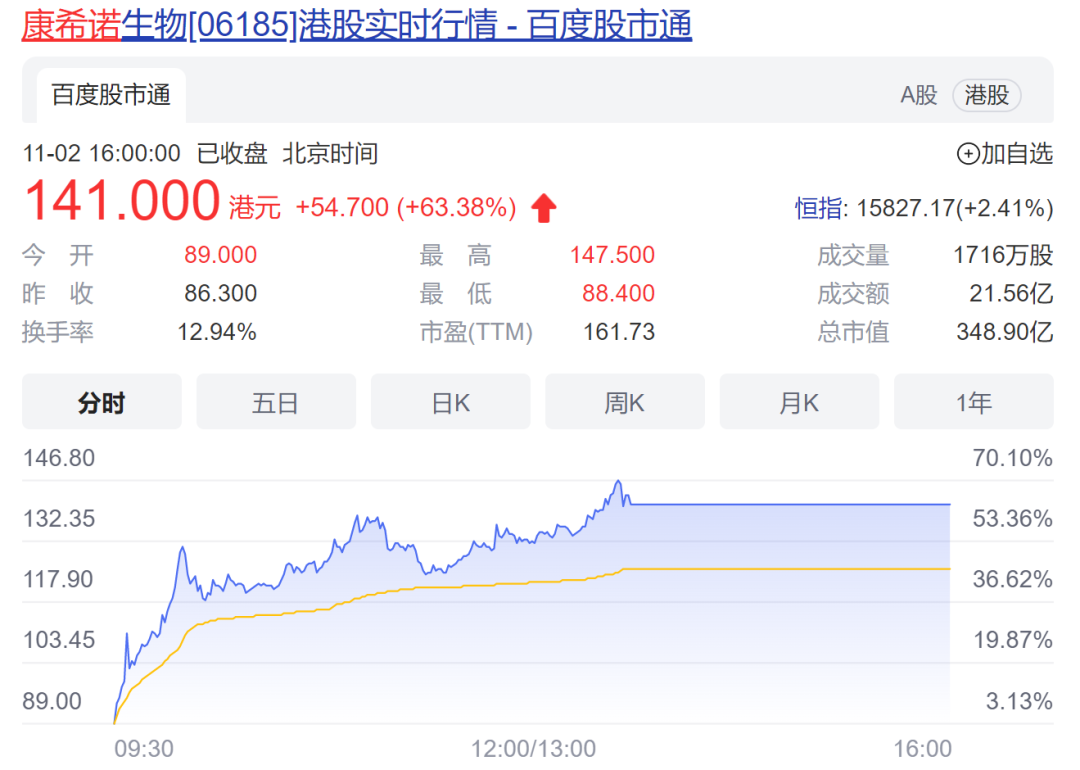 11月1日,在康希诺A股和H股已经连续上涨几天后,康希诺官方微信发布消息称,在继上海开启吸入用新冠疫苗接种后,江苏省十三个城市也已开展吸入用新冠疫苗的部署工作。其中,无锡、淮安和扬州率先开放康希诺生物吸入用重组新型冠状病毒疫苗(5型腺病毒载体)克威莎®雾优®的预约和接种工作。11月2日,康希诺A股直接“20cm”涨停、H股暴涨超60%。
