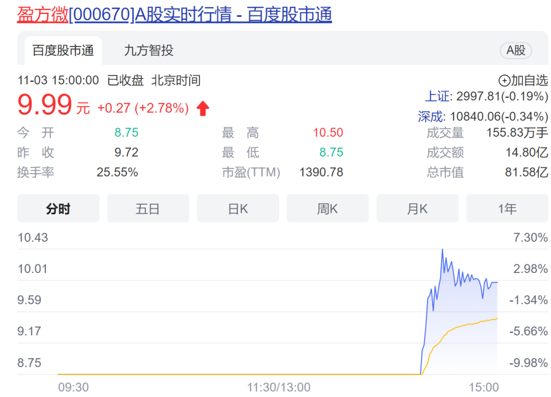 盈方微(000670)重组事项昨日遭证监会并购重组委否决。11月3日,盈方微复牌后股价大幅波动,公司股票开盘后一字跌停,不过下午两点后直线拉升,盘中最高涨幅超7%,最终收涨2.78%。