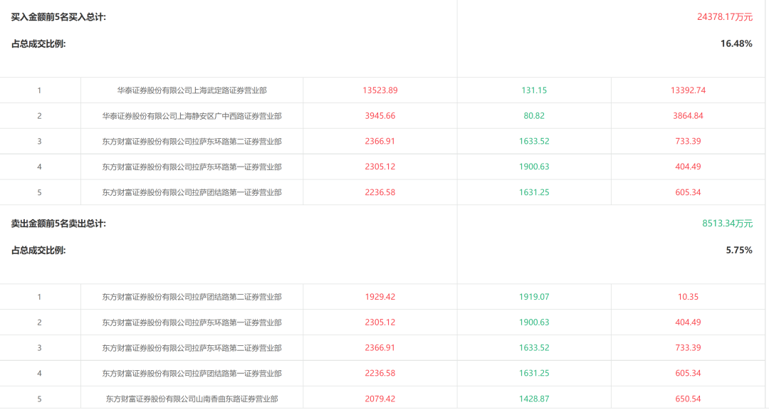 根据盘后披露的数据显示,华泰证券位于上海的两个营业部或是造成公司股价异动拉升的主力。具体来看,华泰证券上海武定路、华泰证券上海静安区广中西路分别买入1.35亿元、3945.66万元;卖出资金则主要集中在东方财富旗下营业部。