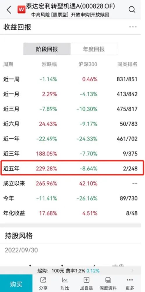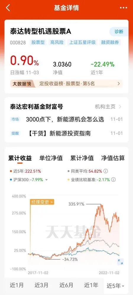 值得注意的是,在2021年11月末,王鹏管理的泰达宏利转型机遇还一度成为当时近三年期的冠军基金,当时近三年收益率超过500%,一度备受投资者的青睐和追捧。