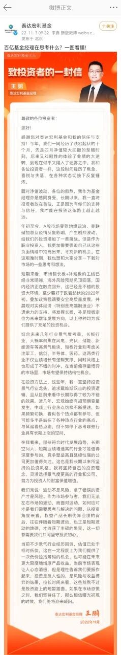 11月3日,管理规模超百亿、普通股票型基金近五年期业绩第2名的基金经理——泰达宏利基金王鹏发布了“致投资者的一封信”。他在信中表示,当前不少景气行业经历回调,估值已处于相对低位,提供了一次“低价捡筹码”的机会,也可能在未来更大限度增厚产品收益。