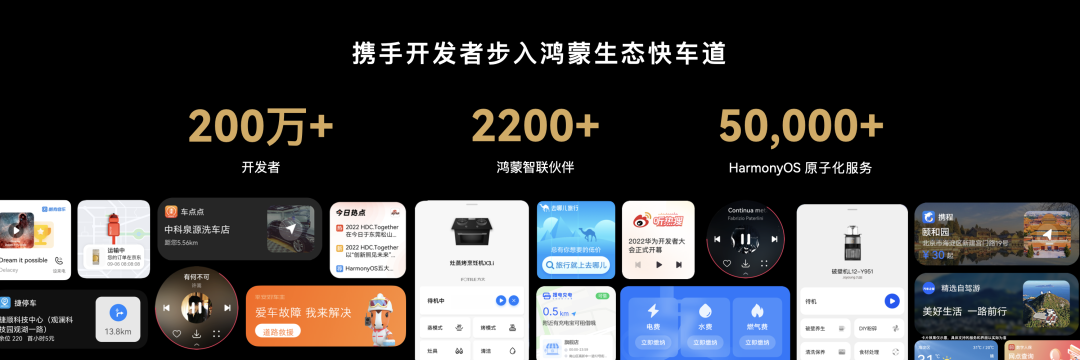 余承东透露,截至目前,鸿蒙智联已有合作伙伴超2200+,产品发货量超2.5亿;鸿蒙生态开发者超200万+,HarmonyOS原子化服务达50000个;HMS Core开放25030个API,近4万款应用跟随华为的步伐走向全球市场。