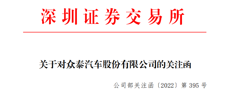 11月4日,深交所向众泰汽车下发关注函,要求说明公司将全面布局整车生产、动力电池、重要零部件、汽车租赁、网约车和汽车售后培训学院等领域,引进动力电池技术并成立合资公司等消息是否属实;分析拟引进动力电池技术的先进性,比宁德时代相关技术更加先进的依据是否充分等。