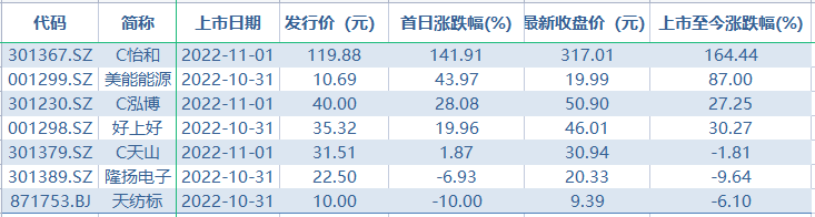 另外,本周上市的深市主板新股美能能源11月3日首次打开一字涨停板,较发行价10.69元上涨85.22%。该股10月31日上市,首日如期上涨44%,随后连获2个一字涨停板。美能能源的主要产品及服务为天然气销售业务和天然气设施设备安装业务。另外,本周上市的7只新股中有2只新股首日破发,分别为隆扬电子和天纺标。