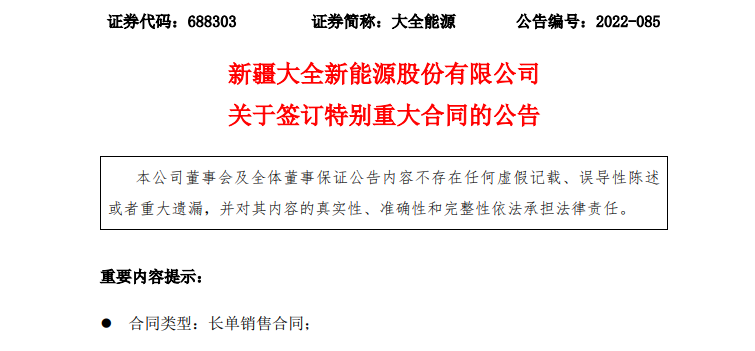 11月4日,大全能源再度公告,公司及内蒙古大全与某客户签订了《多晶硅采购合作协议》,合同约定2022年10月至2027年12月某客户预计共向公司及内蒙古大全采购5.76万吨太阳能级多晶硅特级免洗单晶用料,预计采购金额约为146.96亿元。