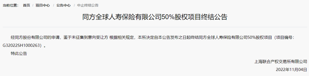 近日,上海联合产权交易所的公告显示,同方全球人寿保险有限公司50%股权转让项目终止挂牌,这也引发投资者关注起这家公司的股权交易进展情况。