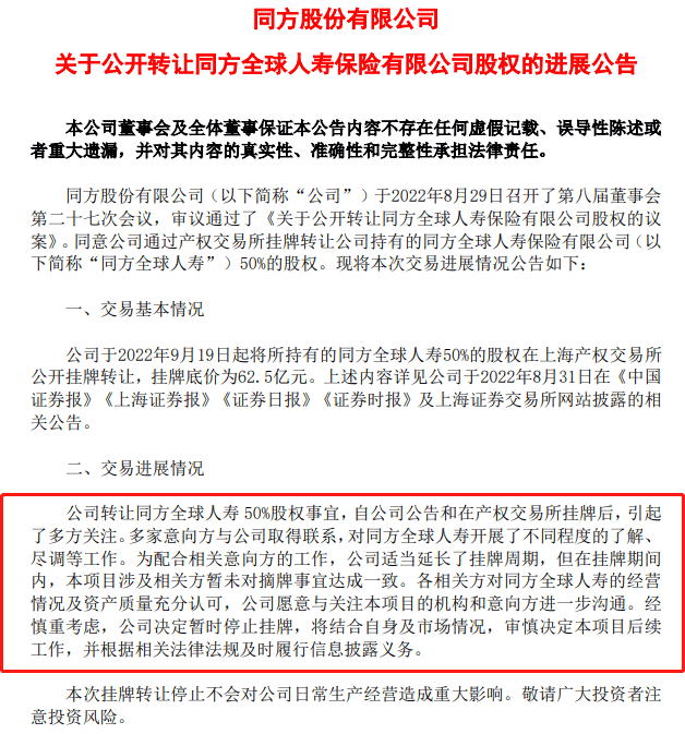 公告称,同方股份转让同方全球人寿50%股权在挂牌后,确实引起了多方关注。已经有多家意向方与同方股份取得联系,对同方全球人寿开展了不同程度的了解、尽调等工作。