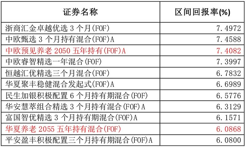 从具体产品来看,多只单品上周涨幅超过6%,浙商汇金卓越优选3个月FOF、中欧甄选3个月持有FOF等多只产品一周涨幅超过7%,其中不乏为个人养老定制的公募养老FOF,如中欧预见养老2050五年持有FOF和华夏养老2055五年持有混合FOF上周分别上涨了7.41%和6.09%,大幅追回了今年以来的跌幅。