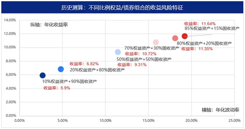 刘潇强调说,组合中权益资产占比越高,组合的年化收益越高,但同时波动率也越高。根据基金的历史数据测算,如果组合由10%的权益资产和90%的固收资产组成,十年期年化收益率平均在5.9%左右,以此类推,如果组合由85%的权益资产和15%的固收资产组成,十年期年化收益率平均在11.64%左右。