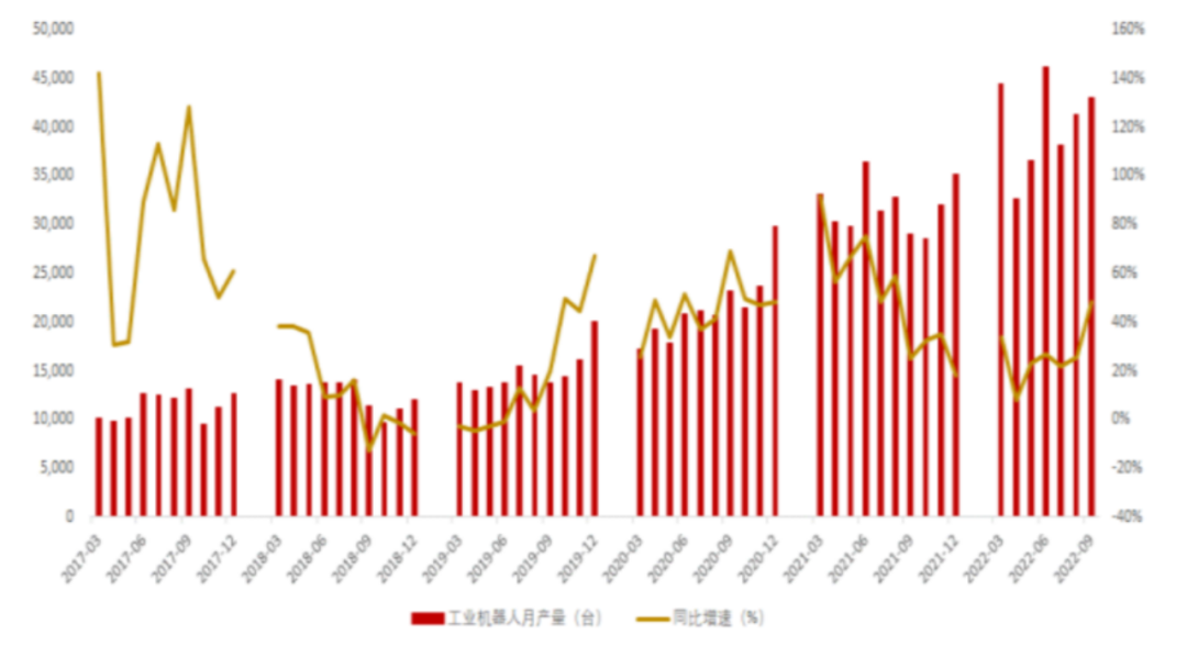 与此同时,疫情后工业自动化生产优势明显,叠加国内人口老龄化问题深化、人工成本不断提高,工业自动化生产相关产品需求不断增加。2022年9月工业机器人产量为43009台,同比增长48.28%;1-9月,工业机器人累计产量为322544台,同比增长20.04%,同比增速有所回升。随着机器替代人的进程不断加速,工业母机结合工业机器人、激光设备的技术不断增加,将加速推动工业母机需求。