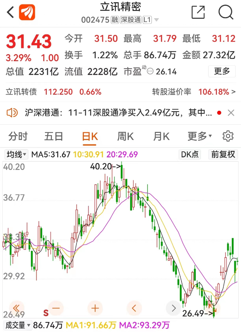 不过意外的是,被市场普遍认为将大概率承接这笔订单的立讯精密,在9日当日涨幅仅为0.22%,甚至出现了1.7亿元主力资金净流出现象。到10日,立讯精密遭遇暴跌,跌幅超过5%。这意味着,当前市场对于果链企业的信心严重不足,取消订单事件动摇了整个行业脆弱的信任链。截至11月11日,立讯精密市值为2231亿元。