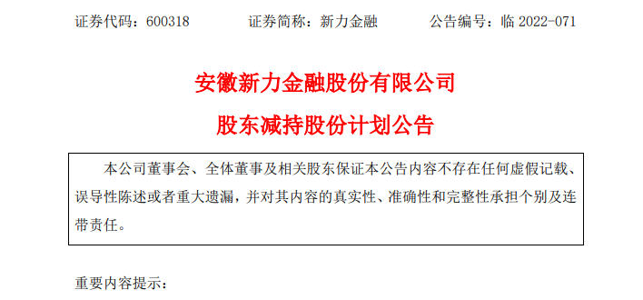 11月15日晚间新力金融公告,公司当日收到海螺水泥出具的《关于减持新力金融部分股份的告知函》。