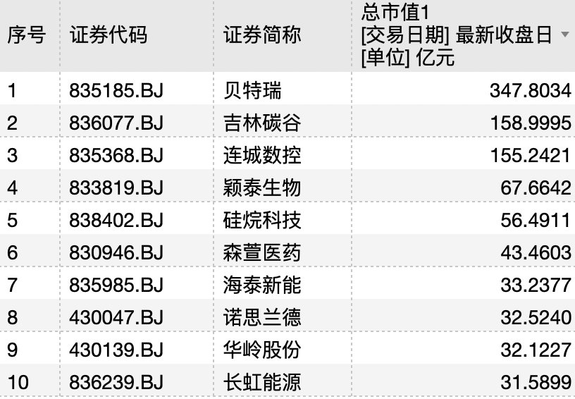 以11月15日收盘价计算,北交所上市公司总市值达1971.06亿元。其中,贝特瑞、吉林碳谷、连城数控今天3家公司市值均超过百亿,分别为347.80亿元、159.00亿元和155.24亿元。
